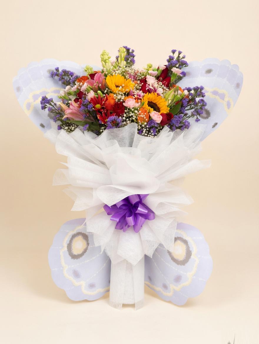 A stunning handmade flower bouquet arranged in the shape of a beautiful butterfly. This colorful arrangement features bright sunflowers, pink lilies, red roses, orange gerberas, and delicate purple statice, all wrapped elegantly in white tissue paper with a purple satin bow. The butterfly wings are crafted from light purple decorative paper with intricate patterns, making it a perfect gift for birthdays, anniversaries, or any special occasion. A cheerful and creative floral design that brings joy and elegance together!