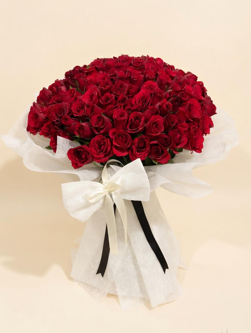 A stunning, oversized bouquet of deep crimson red roses, meticulously arranged in a dense, rounded dome shape. The vibrant red petals glisten with delicate water droplets, adding a fresh, dewy charm. The bouquet is elegantly wrapped in soft white tissue paper and finished with a large, luxurious white satin bow accented by a sleek black ribbon, creating a classic and romantic contrast.