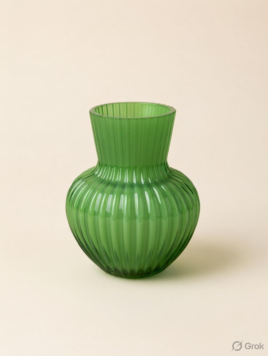Vibrant lime green glass vase with a charming bulbous body and vertical ribbed texture. The ribbed pattern creates beautiful light play and a retro-modern feel, while the narrow neck adds elegance to its rounded silhouette.