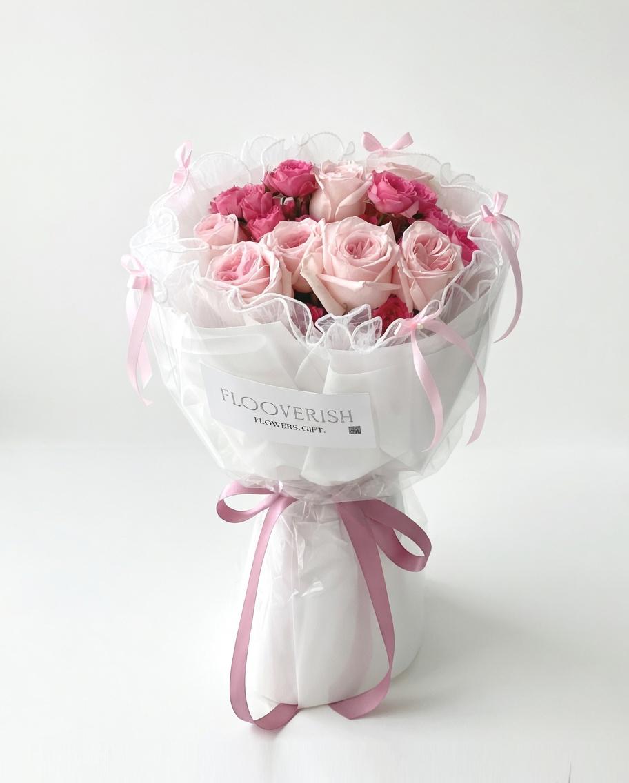 A stunning bouquet featuring 30 luxurious roses in soft blush pink and vibrant hot pink shades. Elegantly arranged and wrapped in delicate white paper with sheer organza and pretty pink satin ribbons, this bouquet creates a romantic and feminine look.