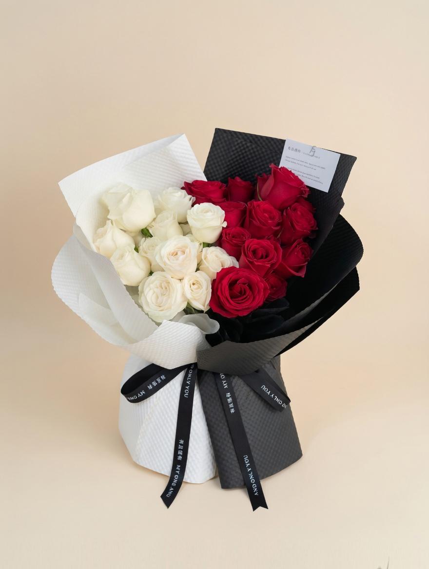 A luxurious and romantic bouquet featuring a perfect blend of deep red roses and elegant white roses. Beautifully arranged in a stylish two-tone wrapping of black textured paper and white textured paper, tied with a black satin ribbon printed with “MY ONLY YOU”.