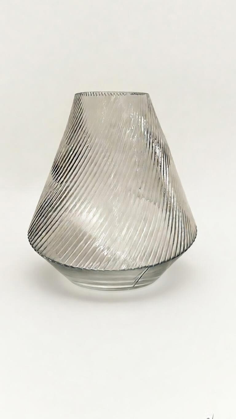 Beautiful hand-blown style clear glass vase featuring a modern tapered silhouette and delicate vertical ribbed texture. The subtle ridges catch the light beautifully, creating an elegant shimmering effect.