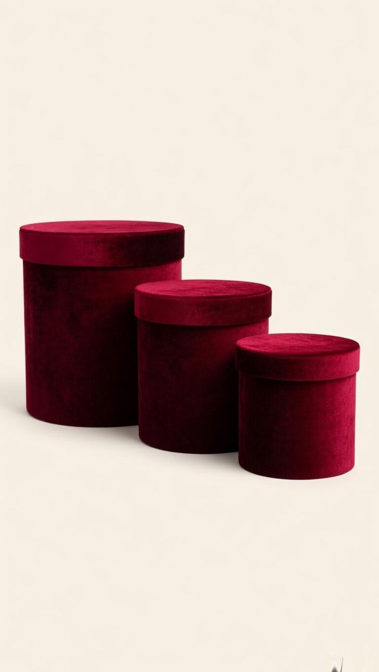 A stylish set of three luxurious cylindrical gift boxes in rich burgundy red velvet. These elegant round boxes come in three different sizes, perfect for creating beautiful gift hampers, flower arrangements, or special packaging. The soft velvet finish gives them a premium and sophisticated look, making them ideal for birthdays, anniversaries, Valentine’s Day, weddings, or any elegant gifting occasion. A versatile and classy packaging solution that adds a touch of luxury to your presents!