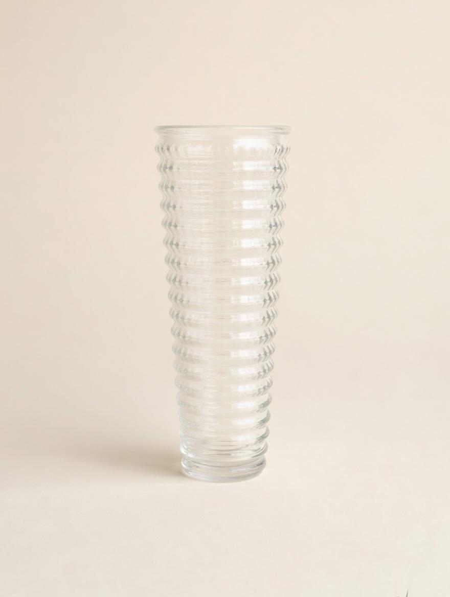 This tall clear glass vase features a sophisticated horizontal ribbed texture that runs across its elongated body, creating a rhythmic stacked-ring effect. The increased height gives it a graceful, slender silhouette while the detailed ribbing produces beautiful light refraction and a subtle tactile appeal.