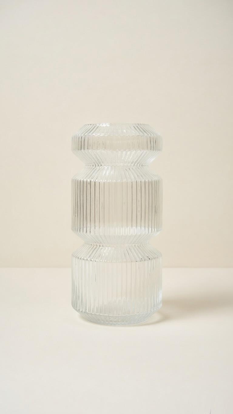 Unique clear glass vase featuring a striking three-tiered stacked design with vertical ribbed texture. The geometric, hourglass-like shape creates beautiful light reflections and a bold, modern sculptural look.